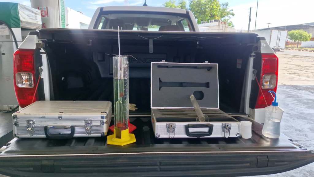 O Agente de Fiscalização da ANP, José Fernandes, explicou que a análise técnica inclui a aferição do volume dispensado pelas bombas, utilizando um equipamento padrão de 20 litros, além de testes de qualidade, como a verificação do teor de etanol na gasolina e do biodiesel no óleo diesel.